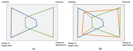 Simplified spider diagrams compare different approaches for web-based EO data analyses (a): systems and interfaces that are easy to use and target various users are less transferable to general applications and provide fewer features (blue polygon), e.g., map viewers. Systems and interfaces with high applicability and many features are more difficult to use and require programming skills, limiting the target users (green polygon), e.g., web-based code editors. (b) It is an ongoing research gap to provide better usability for a larger target group while sacrificing as few features as possible and being generally applicable to various application domains (orange polygon). Specialized cloud services, such as the Copernicus Data and Information Access Services (DIAS), which provide virtual machines (VM) that need to be managed by users themselves, are considered here as a different layer in the technology stack.