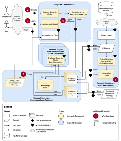 The architecture design and infrastructure implementation as an information processing system for big EO data as conceptually outlined above with its main components knowledgebase, factbase, and inference engine raises many technical and practical considerations and challenges. These considerations range from the conceptual means of codifying knowledge, the arrangement and interoperability of many technical components and catering to a diversity of users. On the side of data handling, we must consider data preparation routines, scalability of semantic enrichment, the semantic EO data cube data model(s) and existing EO data cube software. On the side of processing, we must consider the EO data cube software’s API, complexity of the inference engine and semantic querying language, the GUI for encoding knowledge, and knowledge engineering in general, including transferability and explainability of semantic models and resulting queries. In terms of infrastructure, we must consider scalability and monitoring processes, security and performance issues. Finally, an expert system requires active users, so we must consider user management, user support, and ideally provide a means for sharing user experiences and building a user community. Figure 2 shows an overview of the architecture and the component orchestration, while the next sub-sections describe the individual components.