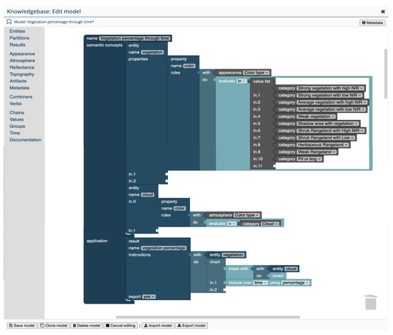 Graphical knowledge engineering approach implemented in our model editor (screenshot). The model editor is based on the Blockly library with our custom blocks for semantic querying. The figure shows the definition of two entities (vegetation and cloud) as semantic concepts based on the properties of combined spectral categories and their analysis through time, which is defined as result in the application part (cloud masked ratio of observed vegetation in any user defined time span and AOI). The semantic model does not require using custom, arbitrary thresholds or image-specific descriptors.