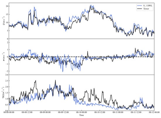Since different types of DWL are used in the study, it is necessary to illustrate the reliability of the observations. The Sansha station tower data were used as the standard values, and the data from S_1 were compared with those of the tower. Tower data at 70 m height were compared with S_1 data at 77.9 m to verify the reliability and accuracy of S_1 observational data. Time series of 15 min mean U, w, and TKE were plotted (Figure 3). The U measured by S_1 was generally in good agreement with that measured by the tower. Both increased gradually in the 12 h before typhoon landfall and reached a peak at around 6:00 on 10 August, with a maximum U of ~21 m s−1. After that, the U gradually decreased. The S_1 data were significantly larger than those of the tower in the 12 h before typhoon landfall, probably because the observation height of S_1 was higher than that of the tower. The analysis of the w shows that the trend of w is more consistent, and both have an obvious sinking motion in the 24 h before typhoon landfall. The difference is that the w of S_1 fluctuates dramatically in the 12 h before typhoon landfall, and the w from the tower fluctuates slightly. The TKE from the tower is significantly larger than that of S_1, especially in the 24 h after typhoon landfall. The different time sample resolutions contribute to the differences between the two soundings; the tower data were acquired with fast-response instruments (20 Hz) that capture energetic turbulent processes that cannot be resolved by the DWL.