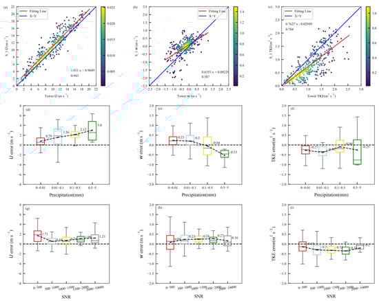To further evaluate the accuracy of the WindPrint S4000 in typhoon conditions, the U, w, and TKE from S_1 were linearly fitted to tower observations at the same height (Figure 4a–c) and the errors plotted as functions of precipitation (Figure 4d–f) and SNR (Figure 4g–i). The best fit is obtained for U: the slope of the fitted line is close to 1, with a correlation coefficient of 0.943. The systematic overestimation of S_1 relative to the tower is about 0.9 m s−1. One explanation for this overestimation is natural variability in U itself. Another reason is that measurements are made at a greater height with S_1 than with the tower. Comparing the w, we found that the fit between S_1 and the tower was poor, with a correlation coefficient of 0.587. The WindPrint lidar data points were mainly distributed above the x = y line, indicating that most of the w of S_1 were greater than those of the tower. The w from S_1 was significantly too low (more negative) when the wind speed of the tower was about −1 m s−1, indicating that the sinking motion measured by S_1 was more intense when there was strong sinking motion. Under precipitation conditions, the vertical velocity spectrum introduced by precipitation will affect the identification of the wind spectrum by DWL. The poor fit of w is probably because the precipitation intensified the sinking motion and S_1 could not distinguish the speed of raindrop landing from the w. The TKE value of S_1 is generally smaller than that from the tower: the slope of the fitted line is 0.763, and the correlation coefficient is 0.784. S_1 underestimates TKE at larger values.