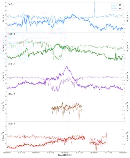 Changes of U and w with time at the same height for the five DWLs, where U is shown as a solid line and w is shown as a dashed line. (a) S_1, (b) P_2, (c) T_3, (d) Z_4, and (e) B_5.