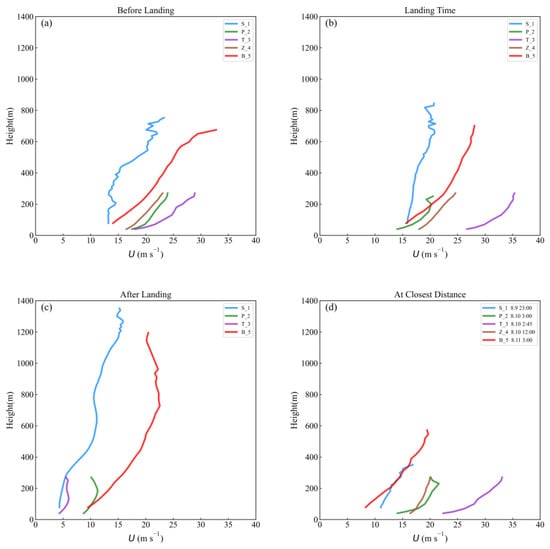 Variation of U with height for DWLs at different moments of the typhoon. (a) at 8 h before typhoon landfall, (b) at the moment of landfall, (c) at 8 h after typhoon landfall, (d) at the closest distance to the typhoon center.