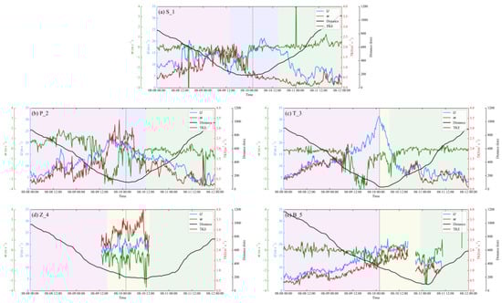 Time variation of mean U, mean w, mean TKE, and distance to typhoon center for five DWLs at altitudes of 70–200 m. (a) S_1, (b) P_2, (c) T_3, (d) Z_4, and (e) B_5. Backgrounds with different colors indicate that the stations are located at different quadrants relative to the typhoon center. The blue solid line represents U, the green solid line is w, the red solid line is TKE, and the black solid line is the distance from the station to the typhoon center. The black dashed line is the time of typhoon landfall. Color shading indicates the quadrant, as in Figure 1b.