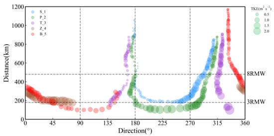 TKE of each DWL as a function of the orientation and distance from the typhoon center. Different colors represent different DWLs, and the size of the scattered points represents the size of the TKE value (m2 s−2).