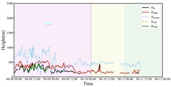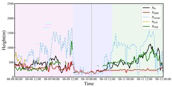 Figure 10 shows the changes of various BLHs from B_5 with time. The data quality at B_5 is poor. humax is larger than other heights and gradually decreased as the typhoon center approached B_5, with a mean value of 550 m before typhoon landfall (Table 5), and was almost constant after landfall, with a mean value of 440 m. hSNR had a mean value of 347 m before typhoon landfall and tended to stabilize after landfall, with a mean value of 163 m. The mean value of hSNR before typhoon landfall was 347 m, and after landfall tended to be stable, with a mean value of 163 m. The well-defined values of hH and hTKE are concentrated between 3:40 and 22:00 on 8 August, when hH and hTKE were similar, with the same trend and mean values of 320 and 295 m, respectively.