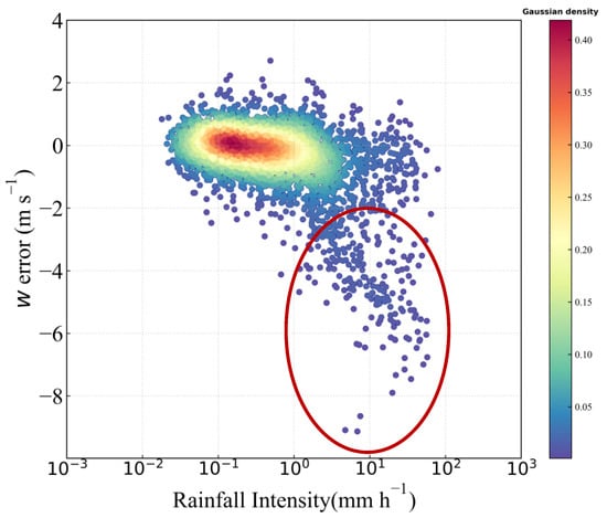 Under precipitation conditions, the vertical velocity spectrum introduced by precipitation will affect the identification of the wind spectrum by DWL. Therefore, DWL has an impact on the measurement of w under precipitation conditions. Meanwhile, we selected a longer period of time (13 August–31 October 2020) to screen the w measured by DWL during the precipitation period, and obtained 4186 samples to study the relationship between w error and precipitation intensity (Figure 11). We found that the w error was mainly concentrated between ±1 m s−1, when the precipitation intensity was less than 1 mm/h, and only when the precipitation intensity was greater than 1 mm/h, the w produced a large negative error. The number of samples with negative error greater than 2 m s−1 is: 277, accounting for 6.6% of all samples, and we think such an error range is acceptable.