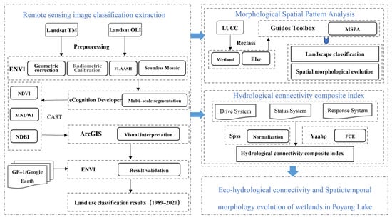 Figure 2 illustrates the technical framework for this study. Landsat images were first pre-processed, then decoded and classified using an object-oriented classification method, and accuracy verification was performed. The decoded images were reclassified into binary images with wetlands and other land classes and imported into the Guidos Toolbox software for MSPA analysis, in order to obtain landscape classification files and data on the spatial morphological evolution of the hydrological connectivity. At the same time, a hydrological connectivity index was created, and the collected and processed index data were normalized. Index weights were determined using Yaahp software, and the fuzzy integrated hierarchy method was used. The hydrological connectivity of Poyang Lake was then calculated from year to year. Finally, the results of spatial and temporal evolution were obtained.
