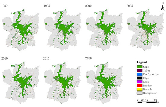 Distribution maps of MSPA types in the Poyang Lake area from 1989 to 2020.