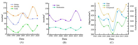 Figure 5. Changes in the landscape types in the Poyang Lake area based on MSPA. (A) Bridge Branch and Loop Landscape type evolution; (B) Islet and Perforation Landscape type evolution; (C) Edge Core and Foreground Landscape type evolution. - (2)