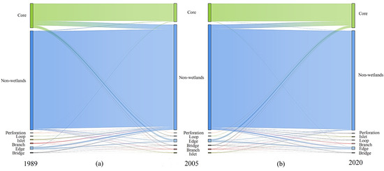 MSPA-based landscape type conversion in the Poyang Lake area: (a) conversions from 1989 to 2005; (b) conversions from 2005 to 2020.
