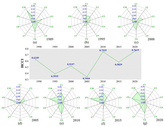 Hydrological connectivity composite index and radar maps for each index: (a–g) the scores of 10 indicators for 7 periods from 1989 to 2020.