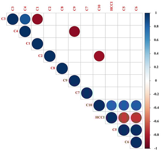 C5, C6, and HCCI had significant negative correlations. When the degree of landscape separation (C5) and landscape fragmentation (C6) increased, the spatial structure of the landscape became discrete and complex, and the hydrological connectivity decreased. C10 and HCCI had a significant positive correlation, i.e., the wetland area rate (C10) contributed positively to the hydrological connectivity, as a higher rate meant higher wetland landscape integrity and higher overall hydrological connectivity (Figure 8).