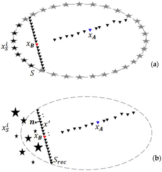 Let us now introduce SI by MDD, which, contrary to SI by CC, neither requires the (one-sided) illumination to be uniform nor the medium to be lossless. The latter is a consequence of the fact that the formulation underlying SI by MDD is derived from a convolution-type Green’s function representation [21]. Let us consider the configuration in Figure 1b, where the receiver at and the receivers at along are illuminated non-uniformly by the sources at . For each of these sources, it can be shown that [10,37]
