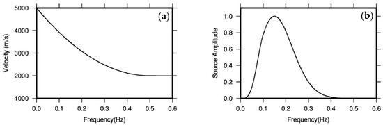 (a) Surface-wave phase velocity of the modelled surface waves as a function of frequency. (b) Amplitude spectrum of the sources used in our modelling.