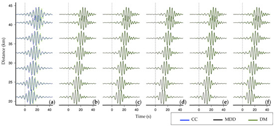 (a) Virtual-source responses at stations TE03–TE09 obtained from SI by CC (blue colour) for a virtual source at station TN08 in the frequency range of 0.2–0.3 Hz. (b) Responses retrieved by means of SI by MDD (black colour), filtered between 0.2 and 0.3 Hz, for a threshold of 85. (c–f) Same as (b) but for a threshold of 90, 95, 97, and 99, respectively. The green colour indicates directly modelled (DM) responses.