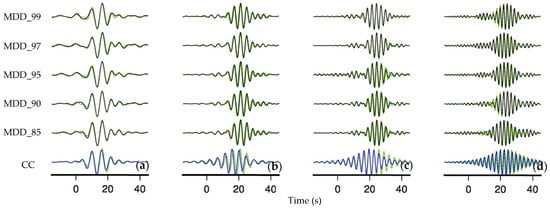 Overall, the results in Figure 5 indicate that for the different receiver pairs, the MDD responses are more accurate than the CC responses and that there is a relatively small difference between MDD responses associated with different thresholds. The results in Figure 7 indicate that the accuracy of the MDD responses is higher than that of the CC responses in the different frequency ranges for the TE07–TN08 pair. We also observe this for other virtual-source receiver pairs.