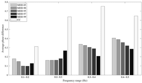 The average absolute phase difference between the directly modelled responses and the SI responses for virtual sources at stations TN06–TN16 (after having unwrapped the phases). The responses to these virtual sources are retrieved at stations TE03–TE09. We have differentiated between SI by CC (white) and SI by MDD (grey to black) for the different thresholds (85, 90, 95, 97, 99). Averages over the various virtual sources, receivers, and discrete frequencies are computed independently for the different frequency ranges.
