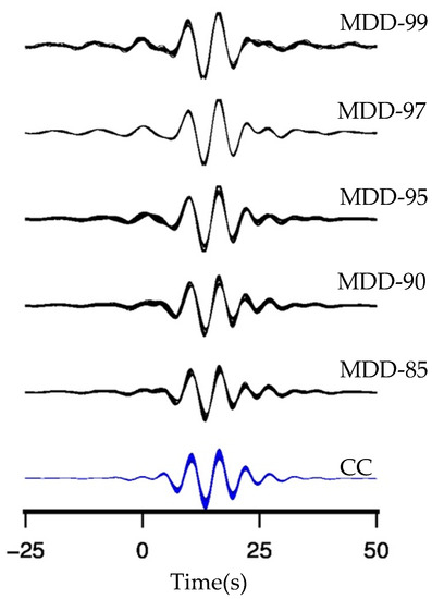 Comparison of the responses retrieved using different methods (SI by CC and SI by MDD for different thresholds) for all realizations from bootstrapping. The responses are retrieved at station TE07 from a virtual source at station TN11 and filtered between 0.1 and 0.2 Hz.