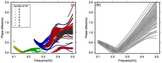 Figure 6a shows the different singular values for individual frequencies, while Figure 6b shows the rank associated with the different thresholds for the individual frequencies. In these figures, we show only the results for the discrete frequencies 0.1 Hz, 0.2 Hz, 0.3 Hz, 0.4 Hz, and 0.5 Hz, but the procedure is, of course, applied to all discrete frequencies in the range of 0.1–0.5 Hz.