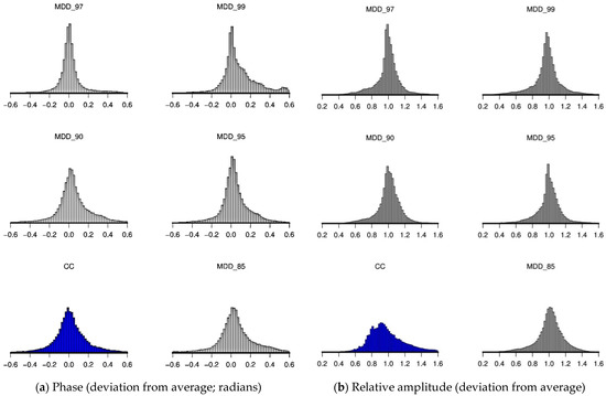 Distributions of the (a) phase and (b) amplitude of the retrieved responses with respect to their mean values for SI by CC (blue histogram) and SI by MDD with different thresholds (grey histograms) for all realizations. Distributions are computed from all virtual-source responses at station TE07 between 0.1 Hz and 0.5 Hz. The amplitudes of the responses are normalized with respect to the mean amplitude for each frequency, virtual source-receiver pair, and method individually.