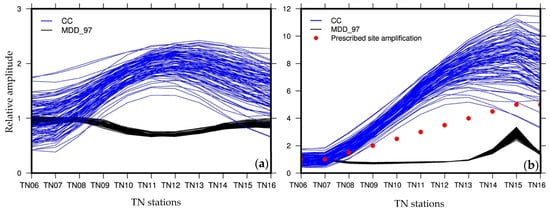 Relative amplitude of the responses retrieved at TE07 from virtual sources at TN06-TN16 in the frequency range of 0.2–0.3 Hz and for all realizations of the bootstrapping method using SI by CC (blue lines) and SI by MDD with threshold 97 (black lines) (a) in the absence of site amplification; and (b) in the presence of site amplification. All amplitudes are normalized with respect to the mean amplitude of the responses from virtual sources TN05–TN07. Red circles show site amplification prescribed for the different TN stations.