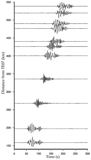 Surface-wave arrivals at station TE07 for the chosen 11 earthquakes (compare with Figure 3). Traces are sorted according to the distance between an earthquake’s epicentre and TE07. The recordings are bandpass filtered between 0.1 Hz and 0.5 Hz.