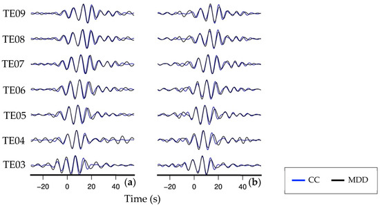(a) Virtual-source responses at stations TE03–TE09 for a virtual source at station TN06 obtained from SI by CC (blue colour) and SI by MDD for a threshold of 97 (black colour) for application of field data in the frequency range of 0.1–0.2 Hz and (b) same as (a) but for a virtual source at TN08.