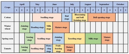 Phenology calendars for the major crops in northern Xinjiang in 2019.