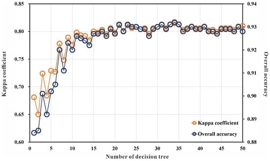 Relationship between the number of decision trees and the overall accuracy, as well as kappa coefficient.