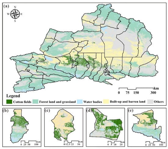 Spatial distribution of cotton fields in northern Xinjiang (a). Some major cotton planting areas are shown in (b) Shawan County, (c) Karamay District, (d) Kuitun City, and (e) Wusu City.