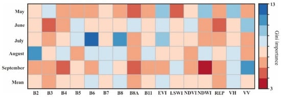 The variable importance of each index can be obtained based on the random forest classifiers, and then the contribution of different features to the model can be determined [42]. It was found that the EVI and the red edge bands (especially band 6) were the most important predictors in the cotton fields extraction process, with the EVI ranked second (Figure 6). Furthermore, it has also been used in previous studies on land surface coverage classification to produce high-precision land use/cover maps, such as shrubs, rice fields, and soybean fields [43,44,45]. Meanwhile, S2 band 6 (RE2) was the most important band in the red edge bands and its importance for crop classification was also confirmed by Radoux et al. (2016) [46]. However, Forkuor et al. (2017) found that S2 band 5 (RE1) performed better than RE2 and S2 band 7 (RE3) [47], which was the opposite of our results. The contrary differences in these results may be caused by the different crops that were focused on in the studies. Furthermore, the contribution made by S2 band 11 (SWIR) was not obvious in the crop classification, and Immitzer et al. (2016) also confirmed its weak contribution in the classification of some crops, although it played an important role in farmland extraction [48,49].