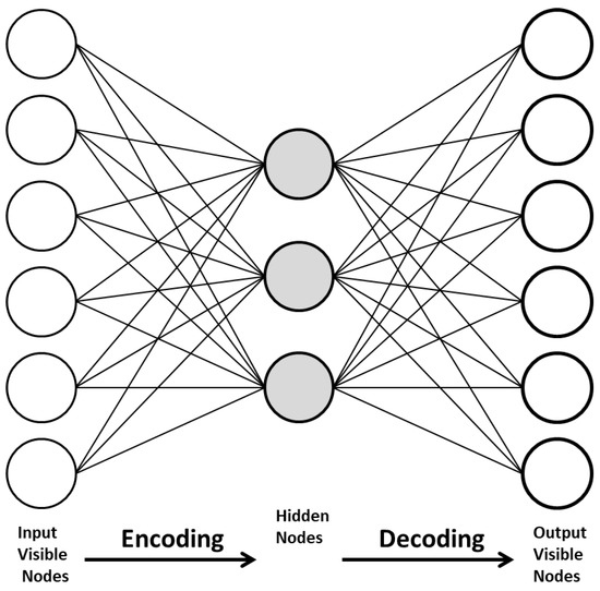 The AE are unsupervised algorithms able to deal with unlabeled data. The main objective of these architectures is to reduce the dimension of input variables in order to facilitate their processing and then learn how to reconstruct the same structure of input data for the output layer [35]. In the encoding stage, features are extracted and details are kept as much as possible. There are many variations of AE networks, such as the deep auto-encoder, denoising auto-encoder, contractive auto-encoder, variational auto-encoder, and sparse auto-encoder. They are generally used in association with other architectures. Recommendation systems, anomaly detection, dimension reduction, or image processing are some application cases of AE systems. Figure 3 presents a simple structure of an AE network.
