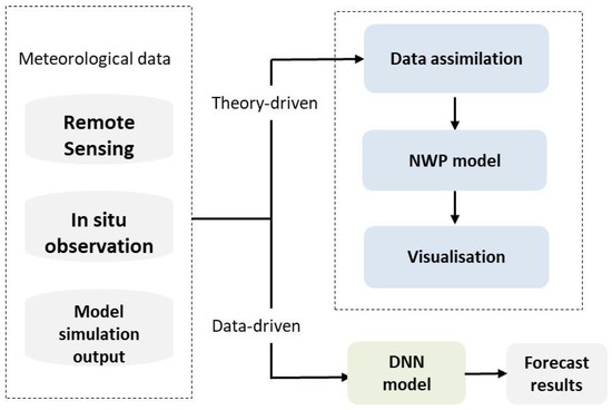 Weather forecasting tasks consist of predicting future conditions of the atmosphere (namely the temperature, humidity, and wind) for a given location and time. It is an important issue for disaster management. With the development of meteorological satellite technology, satellite cloud images allow for the characterization of the distribution of clouds on the image and are used to track the evolution of large-scale weather systems [39]. In addition to the classical numerical weather prediction (NWP) approach, DL techniques are used today by data scientists for weather forecasting and achieve more accurate results due to the availability of massive weather observation data and the advent of both information and computer technology [39]. Figure 8 illustrates the two concepts for weather forecasting: the theory-driven and the data-driven approaches. The theory-driven approach is focused on the understanding of physical mechanisms and uses NWP-based models for predictions, while the data-driven approach uses the spatial and temporal relationships between meteorological data and DL techniques. One can observe in the figure that the theory-driven method consists of three steps (data assimilation, execution of the NWP model, and visualization), while the data-driven approach directly uses data and DL algorithms to make predictions.