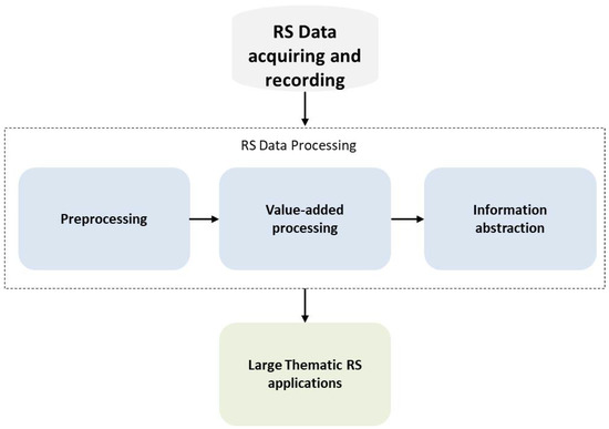 Remote sensing can be defined as all the techniques that allow for the acquiring of information about objects without direct contact with them. One of the most common types of remote sensing is remote sensing using satellites as a platform and producing information in the form of images. Today, more than 4000 satellites are orbiting around the Earth. Each satellite has its own sensor which gives specific data. They take pictures of the Earth at a given place and time. Thus, a satellite image (SI) or remote sensing image is an image representing a part of the Earth (or another planet) obtained from data recorded by a sensor installed on a satellite [2]. A list of operational satellites, with their characteristics and main objectives, is available on the satellite database of the Union of Concerned Scientists: https://www.ucsusa.org/resources/satellite-database (accessed on 25 August 2021).