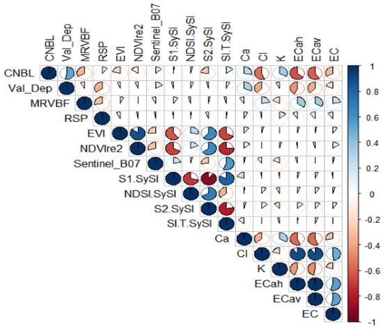 The Pearson correlation coefficients were calculated between soil salinity from the topsoil (0–30 cm) and environmental covariates. The statistical analysis was performed in the R environment [66], using the package corrplot [75].