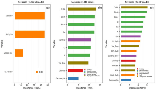Relative importance of environmental covariates (%) for predicting ECe content in various datasets for the best prediction models. (a) Scenario (1): modeling with SySI bands and salinity indices derived from it; (b) Scenario (2): modeling with RS data, PS data, topographic attributes, geology and geomorphology maps; and (c) Scenario (3): modeling with a combination of Scenarios (1) and (2). The environmental covariates are presented in Table 2.