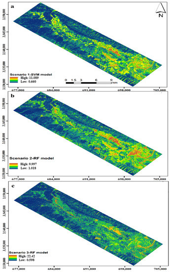 Figure 6 shows the spatial distribution of ECe using the best performance model for three scenarios. The spatial patterns of ECe produced for the three scenarios corresponded with the distribution of known topographic features in the region. The prediction maps of ECe by the three scenarios indicated that ECe tended to increase from northwestern to south and southeastern regions. The regions with high ECe were located in low elevations and playa, where halophyte plant Suaeda aegyptiaca grows. The regions with low ECe were located in the higher elevations with steeper slopes and alluvial fans (Figure 1 and Figure 6). A large amount of salt is likely discharged from the middle and upper parts of the alluvial fans [12]. The discharged salts flow to the surrounding area at a low altitude in central and southern areas (Figure 1 and Figure 6). Generally, this is because the higher sections of the area have a sandy texture and low salt absorbability. There occurs leaching and discharge of salts to the lower parts, which have a clay texture and poor drainage (Figure 6). The spatial patterns of ECe also corresponded with the lithological map so that the soil of the southern parts generally has a geological formation and , which contains salt (Figure 1a and Figure 6). As shown in Figure 6, three scenarios predicted low ECe values appropriately; however, the high ECe values are relatively underestimated. The minimum predicted ECe by Scenario (1) is 0.660 dS m−1, and the maximum is 11.089 dS m−1 (Figure 6a), while the maximum ECe by Scenarios (2) and (3) are 9.997 dS m−1 and 22.42 dS m−1, respectively (Figure 6b,c).
