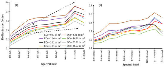 Reflectance of the soil samples with different salinity levels in the (a) SySI bands and (b) Sentinel-2A spectral bands.