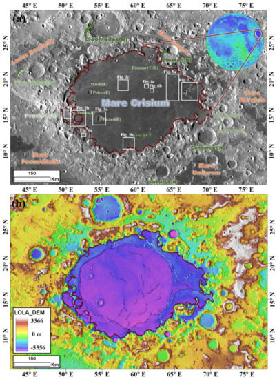 - Sliz, M.; Spudis, P. New geological map of the lunar crisium basin. In Proceedings of the Lunar and Planetary Science Conference, The Woodlands, TX, USA, 21–25 March 2016; p. 1678. [Google Scholar]