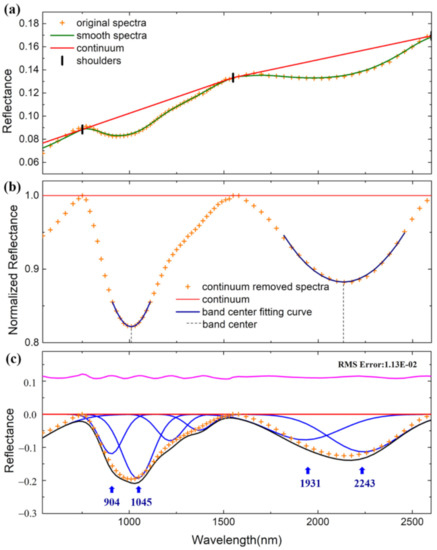 The continuum of reflectance spectra was automatically removed by the automatic detection of band centers (Figure 2) This approach is employed by Horgan et al. (2014) [43], who assumed an upper convex hull, finding a linear continuum with adjustable tie points around a 1000 nm absorption band and a 2000 nm absorption band. Continuum removal is performed by dividing the initial spectrum by the continuum interpolated spectrum. We searched for shoulders at 660~930 nm and 1109~2018 nm of a smoothed spectrum, which minimized the effect of instrument noise. Band centers (BC) were derived from the wavelength corresponding to the minimum value of the second-order polynomial fit of the smoothed spectrum between the band and band (m corresponding to the band with minimum reflectance, n = 5 at 1000 nm and n = 8 at 2000 nm). The IBD were also calculated by integrating the band depths (the reflectance to continuum ratio at the same band) [39,40]. The formulae of BC and IBD are listed in Table S2.