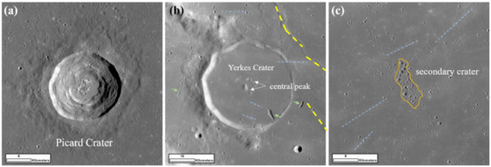 The Picard crater (Figure 3a) is the largest crater within the Crisium basin, with a diameter of 23.7 km. It exhibits complex features including central peaks and terraced walls. Secondary craters by ejecta are distributed surrounding the Picard crater. Besides post-mare craters, more than 14 pre-existing mare craters (ranging from ~2 km to ~34 km in diameter) are not completely erased. Most pre-existing ones are located on the basin rim, exhibiting a relatively higher elevation. Yerkes crater (Figure 3b) is one of the pre-existing mare craters that has an intact rim and multiple central peaks. Secondary crater chains and clusters (Figure 3c) are common in the Crisium basin. The primary crater ejecta is from Proclus and Giordano Bruno craters. In addition, discontinuous and secondary craters of Langrenus and Taruntius are also found in the central and eastern areas in the basin [48].
