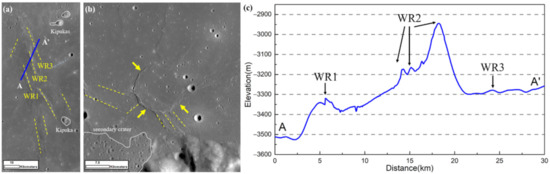 Most wrinkle ridges are located near the Crisium basin rim, but some are in the center of the basin. The wrinkle ridges can be developed with a length of hundreds of kilometers and a width of a few kilometers. These wrinkle ridges are concentric in the center of the basin. The most common wrinkle ridges are linear (Figure 5a), but some special ridges are arcuate and nearly circular (Figure 5b). Interestingly, three linear and subparallel wrinkle ridges (WR1, WR2, and WR3, Figure 5a,c) have the preferred orientations (NW-SE trend) along the outer ring of the Crisium basin. This trend suggests that the wrinkle ridges formation in the eastern maria was affected by the ridges system of the Crisium basin.