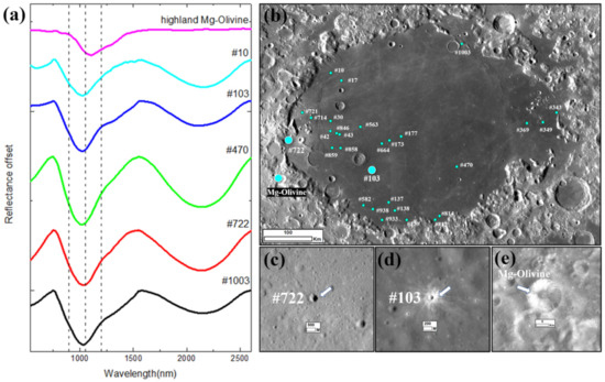 (a) The continuum-removed spectra of small fresh craters exhibit a broad absorption at 1000 nm, which indicates an olivine-rich component. Three dashed lines are the absorption centers of olivine near 900 nm, 1050 nm, and 1200 nm, respectively. (b) The positions of these craters are labeled in the Crisium basin. The insets of (c) #722, (d) #103, and (e) an exposure of olivine in highland massifs in Figure 11b demonstrate the topography of these olivine-rich craters.
