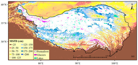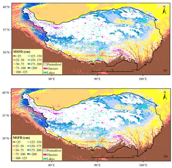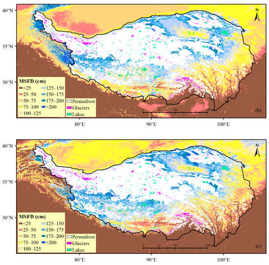 Spatially, using remote sensing variables for mapping the MSFD could show richer details, especially in the southern QTP, and the transition zone of the MSFD in the range of 25–100 cm was more obvious. This difference in detail might be related to the data richness of the FDD, and the FDD based on reanalysis data was calculated using monthly average temperatures that were interpolated using coarse-resolution weather data (spatial resolution of 5 km).
