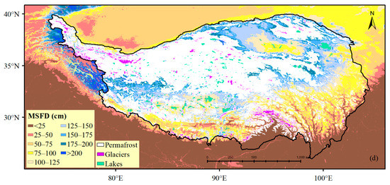 The permafrost, glaciers and lakes were excluded in the final simulated MSFD map. The permafrost area adopted the recently released high-precision 1km spatial resolution permafrost map [29]. Glacier extent used the Global Land Ice Measurement from the Space (GLIMS) geospatial glacier database [69], that could be downloaded at http://nsidc.org/glims/, accessed on 24 November 2021. The lake extent was derived from the levels 1 of the Global Lakes and Wetlands Database (GLWD) [70].