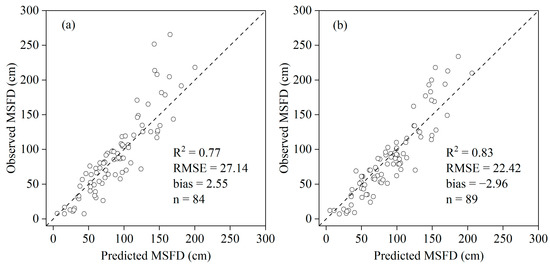 The MSFD in the historical periods (1981–1990 and 1991–2000) was simulated using the SVR model trained in the baseline period (2001–2010) with simplified climate variables (Figure 4). We assumed that the conditions of soil properties, elevation and solar radiation were constant and changed the model input conditions of rain precipitation, snow precipitation, FDD and TDD for the corresponding periods. Eighty-nine observed MSFDs in the 1980s and 84 in the 1990s were used to validate the simulation results. The results showed that the predicted and observed values were in good agreement (Figure 5), which indicated that SVR with the simplified climate variables had good transferability. Compared with the 1990s (R2 = 0.83, RMSE = 22.42 cm), the simulation results for the 1980s (R2 = 0.77, RMSE = 27.14 cm) had a larger error, with an increase in the RMSE of 4.72 cm. Compared with the baseline period, the bias increased by 3.32 cm and 2.19 cm in the 1980s and 1990s, respectively, which suggested that the statistical/machine learning models had a time scale limitation in terms of reconstructing the spatial distribution of the past MSFD, and the uncertainty in the simulation increased with time from the baseline period. Therefore, prediction of the past and even the future MSFD could be achieved according to the method developed in this paper even if there were no environmental remote sensing variables related to the MSFD, e.g., land surface temperature, LAI.
