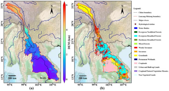 The Global Multi-Resolution Terrain Elevation Data (a) and the Terra and Aqua combined Moderate Resolution Imaging Spectroradiometer (MODIS) Land Cover Type (b) in the Lancang-Mekong River basin.