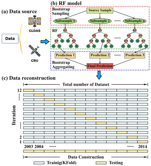 With the advent of remote sensing, machine learning and data mining techniques have emerged in meteorology and hydrology [18]. Ndehedehe and Ferreira [19] predicted the TWS using a partial least squares regression (PLSR) model and suggested that the TWS in some river basins is weakly associated with climate. Huang, et al. [20] quantified the effects of climate change and human activities on vegetation dynamics using a support vector machine (SVM) model, providing some guidance for ecological restoration on the Loess Plateau. Nguyen, et al. [21] proposed an artificial neural network to reconstruct long-term and high-resolution precipitation, which has been widely used in the geosciences. Li, et al. [22] combined climate variables and catchment attributes to estimate annual discharge using a random forest (RF) model. RF is an ensemble method combining several weak learners to produce a strong learner that yields the optimum results. Additionally, each variable can be sorted by importance, making this model more explanatory [23,24,25]. Combined with LSMs and meteorological forcing data, RF provides a comprehensive perspective on TWSA reconstruction.