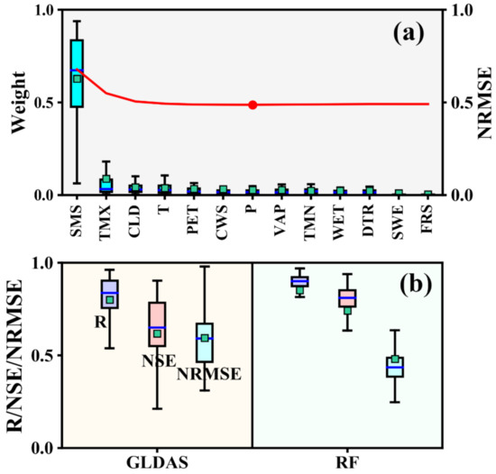 Grid-scale analysis in the Lancang-Mekong River basin for 2003–2014. (a) Relative weight of the variables in the RF models; the red line represents the model error. (b) Comparison between the GLDAS and RF models; the left (right) panel shows the boxplots of R, NSE, and NRMSE calculated from the GRACE TWSA and GLDAS TWSA time series (RF-built TWSA time series).